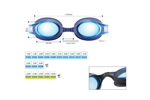 Plaukimo akiniai, kurie gaminami pagal Jūsų individualų užsakymą su skirtingomis dioptrijomis. Rekomenduojama paugliams ir suaugusiems (medium dydžio). Darydami užsakymą – pažymėkite reikalingą kairės (OS) akies stiprumą ir įdėkite į krepšelį, o vėliau dešinės (OD) akies lęšių stiprumą ir įdėkite į krepšelį (pvz. kairė -1.00, o dešinė -3.00). Plaukimo akinių galutinė kaina gaunama sudėjus dviejų lęšių kainas.